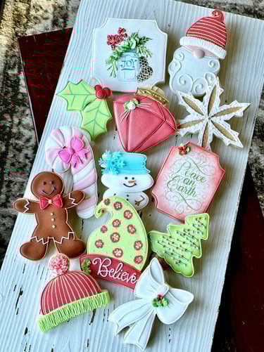 ANSWER 1. I seek inspiration everywhere...I've taken photos of ceiling tiles in restaurants because I loved the color and the design and wanted to "cookie it." I believe that what we see first, can formulate how we may begin to feel about something...so when I am creating new designs for a class, or a custom order - after knowing/deciding the theme....I of course want the color palette to coordinate, enhance, or even shift someones view from what may be typical to - wow, I hadn't thought of that! For example, during the holidays, I feel compelled to use not only traditional shades of red and green, but include hot pink, mint or lime green, and turquoise. Those colors make me happy and I hope they highlight the holiday shapes and make the recipient feel some happiness as well.