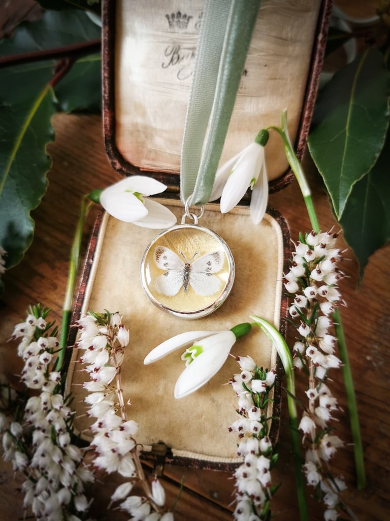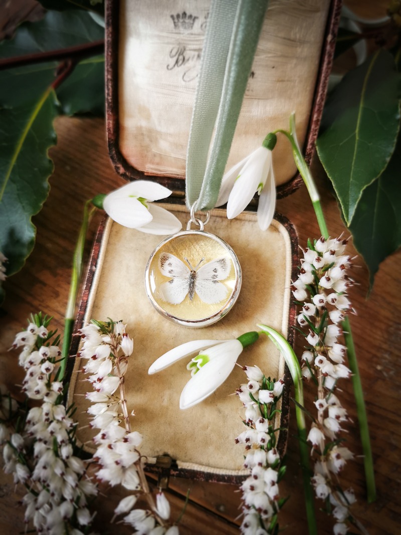 Today she works from home in her Somerset garden studio. Her love for nature, history and anything old rubs off on the work she creates today. Stubbornly refusing to ‘niche down’ to one medium or style, she takes great pleasure in following her creative curiosity to make pieces which spark joy. Botanical studies, whimsical jewellery, verre eglomise, plaster casts of nature finds, experimenting with materials and applying gold leaf to most things.
