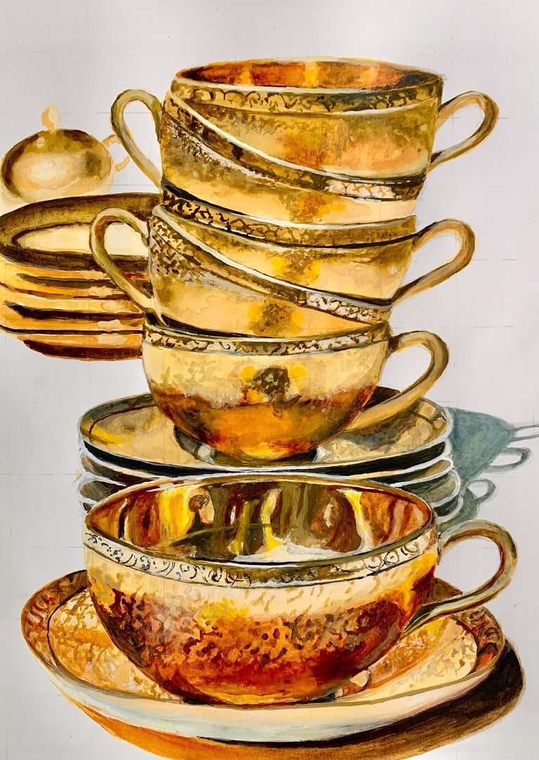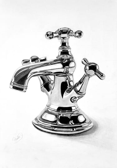 Painting shiny effects is what occupies me the most these days. It can be various materials like silver, gold, bronze, glass, and steel. To challenge myself, I use different media to recreate these on paper or canvas. For example, how to bring out gold with watercolor, colored pencils, or pastels.