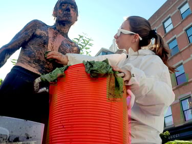 ANSWER 2. There is no conflict between us. Since the first day we met, we have always shared everything: meals, sexuality, living spaces (even the littlest ones). Ideas are spontaneous and usually complete each other. Our performances contain the same amount of psychological/bodily fatigue for both of us. Like in the performance Silvia Overcomes Depression: Massimo holds Silvia in arms for about 30 minutes with a few pauses and Silvia talks about her mental health and sexual harassment. In The Circle Of Dirtiness And Cleanliness Massimo keeps on soiling himself with mud and Silvia cleans him up continuously and gets as dirty as him in the process. In Horrifascism we hold the banner for hours like equal columns. So no leader is needed.
