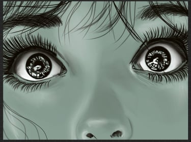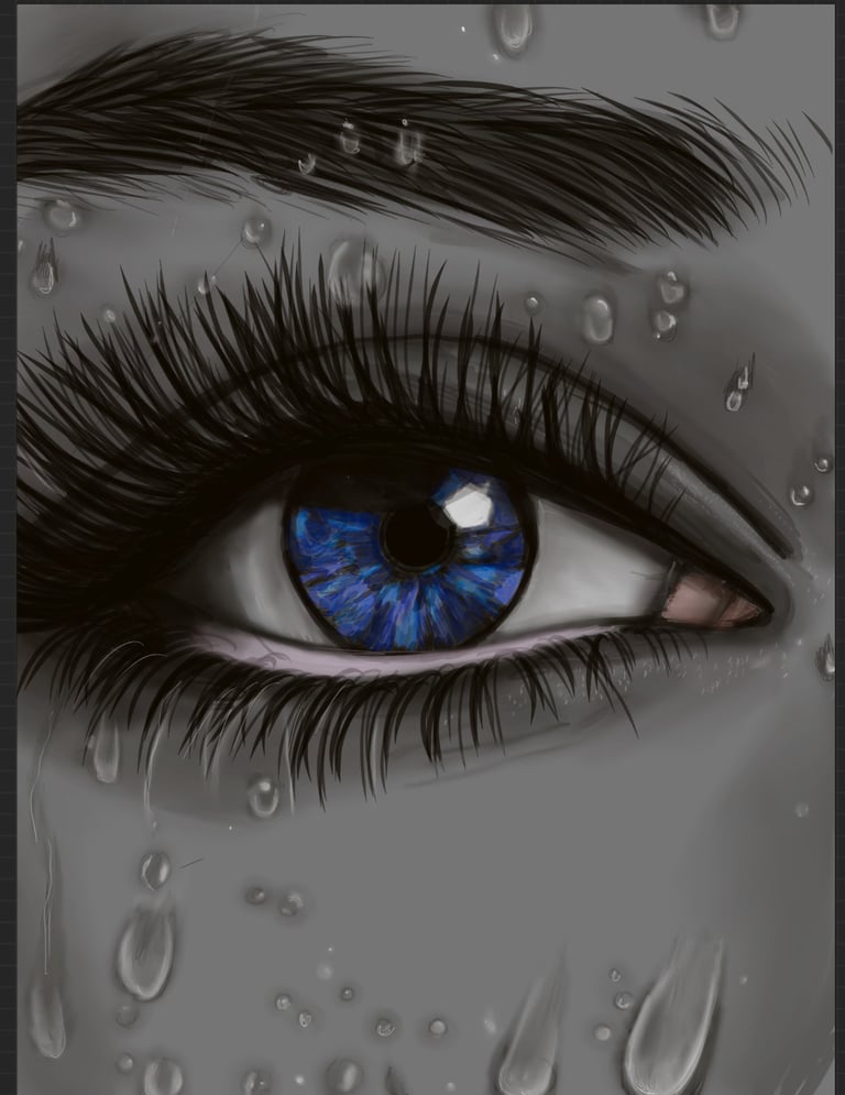 ANSWER 2. With my surreal pieces, I like to think I have evolved over time with influences such as Frida Kahlo. I found her inspiring in how she could create a new fictional world to compensate for the lonely stretches of her reality. I find muted basic tones next to bold colours, or using a mix of clashing techniques in close proximity, gives great contrast and highlights the difference between them, making each one stand out that much more. Kind of showing that, whilst they are polar opposites to each other, they can still work together to make a cohesive finished portrait. Both can exist simultaneously. I often draw focus to eyes as I believe they can express so many emotions without needing the rest of the facial features to tell a story; they are storytellers in their own right.