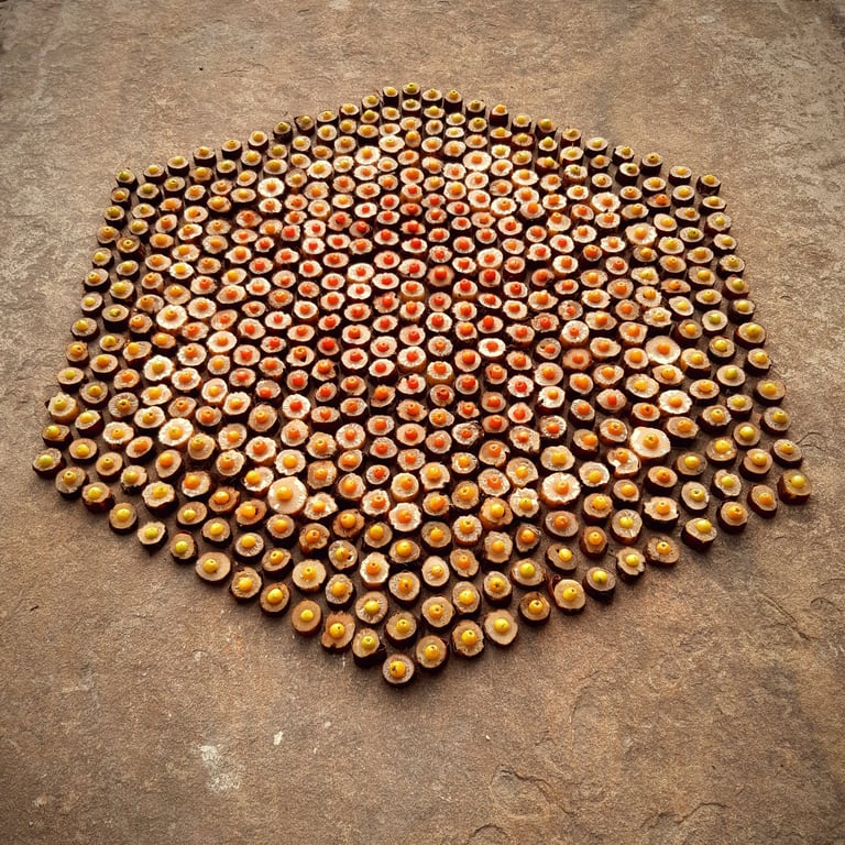 ANSWER 3. Site specificity is vital in my work. Nature art can be just about clearing a space in the leaf mulch on the woodland floor and making something there but when it works well the art is in tune with its setting and there’s a two way conversation between it and its surroundings like my piece, Bridge #1 which is actually made on a flat gravestone and its hexagonal shape was chosen because of its symbolism in some religions as a bridge between the worldly and the divine.
