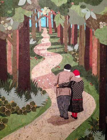 A Japanese friend told me about an artist residency in a paper making village in Japan and encouraged me to apply. I did, and was invited to participate for three months . It was a life changing experience. We were being supported to use beautiful washi paper produced in the village. With all expenses paid, a stipend, a home stay and a 24 hour studio, I put down my brushes, bought some glue, picked up scissors, and started using paper in a painterly fashion. I fell in love. I found I could do everything I was doing with paint, but had the extra joy of playing with pattern and texture. That was 22 years ago, and I have never regretted the decision nor the direction my work has taken me.