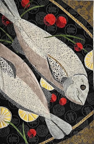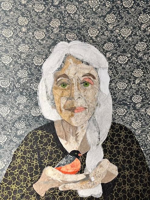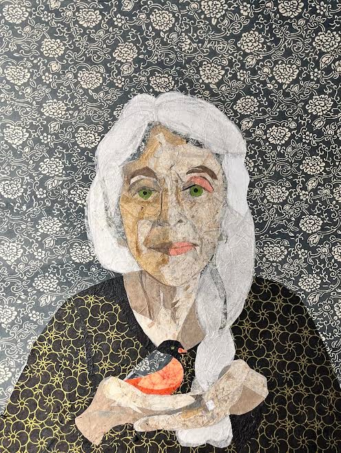 BIO: I am a self-taught artist who “paints with paper” in an intuitive and playful manner. I take my inspiration from the great painters of the past, beautiful handmade papers from around the world and from the fortunate life I live.