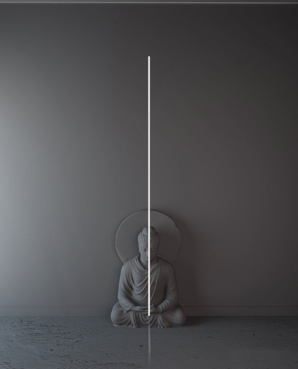 ANSWER 2. If the viewer is to the side, they cannot see the lines. Only when they are in the center can they properly see the lines. This is because the wall behind and the Buddha are pierced by a single line. And because the wall is pierced, natural light creates the lines during the day, and darkness creates the lines at night.