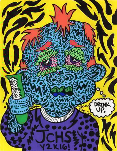“Drink Up!”, 2024, Posca markers on watercolor paper, 9x12