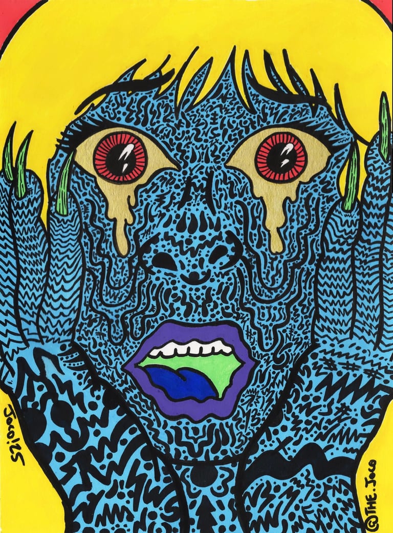 “American Beauty 2: Electric Beautyloo”, 2025, Posca markers on watercolor paper, 9x12 (blue girl with melting face)