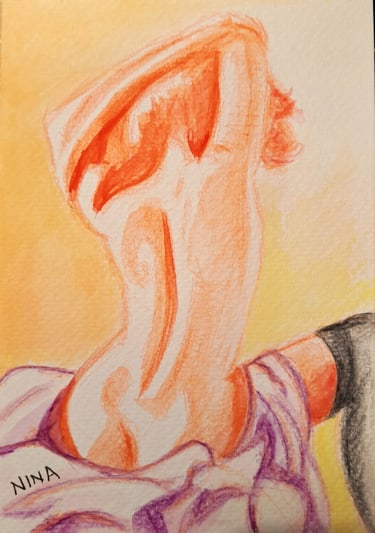 ANSWER 2. My past works in mixed media were more frenzied, angular and color-saturated. These watercolor works, though still colorful, use a limited palette and are more controlled. Usually when people think of watercolors, they think of landscapes or nature-inspired subjects. My work aims to juxtapose that feeling of delicacy and softness of the media with a definitive air of power emanating from the subjects. The fragility of the watercolors reflects the feminine aspect, but imbued with bold color, heavy marks and compositions that speak to autonomy and empowerment. The women depicted are in a fermata, a state of pause where something of note has either just occurred or is about to. By choosing to focus solely on one [female] figure, the power lies completely with the subject, who is at once in control of her body and her surroundings, but also untamed.