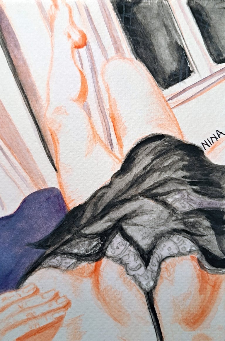 QUESTION 2. Watercolor can feel fragile and unforgiving. How do you use that delicacy to reinforce themes like softness, longing, or quiet tension rather than fighting against it?