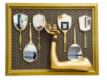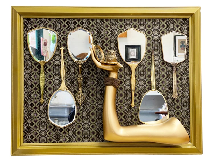upcycled treasure including vintage hand mirrors, brass owl, mannequin arm, vintage frame and fabric, 80 x 50cm