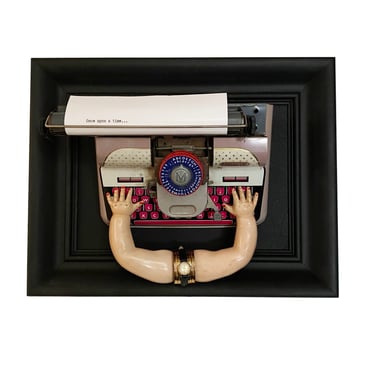 upcycled treasure including vintage toy typewriter, doll hands, antique watch, vintage frame, 40 x 30cm