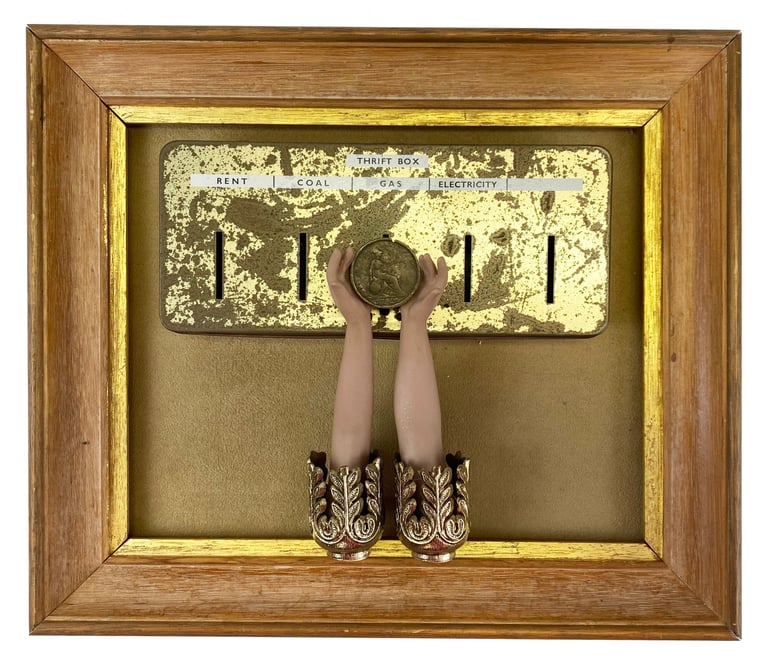 upcycled treasure including old money box, doll hands, coin,