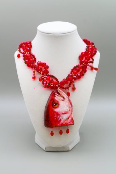 ANSWER 3. I think a lot about the comfortability of my pieces, which is why I refrain from using heavier materials like porcelain or stones. I also think about the visual effects the jewelry will have once worn. For example, with my "Fish Market" necklace, I wanted the necklace part to simulate blood dripping from a wound in the neck, mimicking the fish head with the blood drippings. So, in a way, the wearer is the fish. However, my audience are more drawn to the intricacy of the beadwork, the rich color, and the total surprise of the fish head as the statement piece.