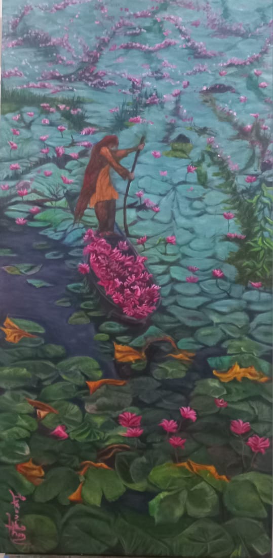 Mystic Flotilla is a part of my series for my solo show expected in 2026. This particular painting is close to my heart. The plight of the Palestinians can be seen all over the world and read about but very few have been able to do anything about it. The collective which launched the Flotilla and the reason behind it was to help them when the world leaders were silent. A woman began this with a small attempt and despite the hurdles, each time she came back with a larger force till the final one which was this Flotilla. This painting has a message of perseverance, life, hardships and success, the things I am unable to articulate in words about that woman.