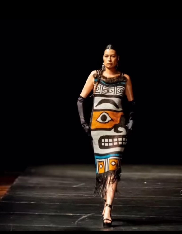 Haida Dress - designed in collaboration with indigenous designer, Yolonda Skelton. Anodized aluminium rings, with leather and fur. 2024.