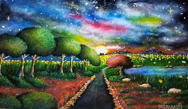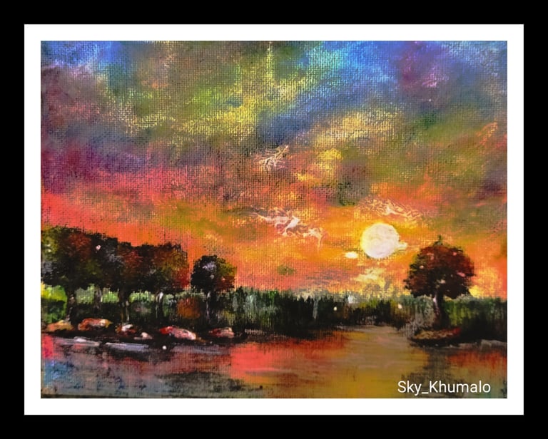 BIO: Sky Khumolo is on ortist based within Jonannesburg, South Africa. She is interested in the indigenous knowledge of the African people. and most importantly the African landscapes. Found in South Africa, Khumalo's new body of artworks ore greatly influenced by her late mother who lost her life to Cancer on the 17th of Januory 2024 at 13:42pm. Through this life changing experience she found comfort in the Sky above, the noture around her and most importantly knowing that God will always be there in the good times and bad times. And that he will give you strength to overcome anything Eg a person con be described as a tree in this journey we call life and as a tree you experience different seasons in your life, one moment it's Summer and everything is great the next it's Winter and everything is Cold and you don't want to do onything