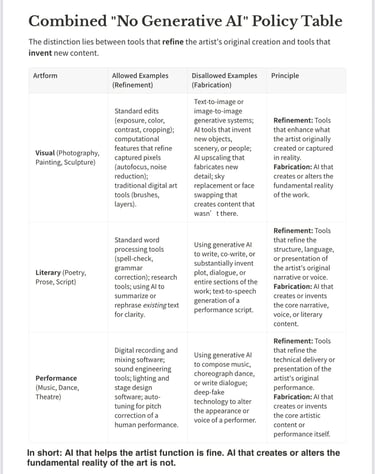 These are computational tools that enhance, edit, or process the artist's original, human-created content without fabricating new, core elements. In short, AI that helps the artist function is fine. AI that creates or alters the fundamental reality of the art is not.