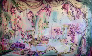 Performance adds the body to that dialogue. When I paint live or perform “Interlace” ("Interlace" is a performance where I live paint onto a dress that a singer/performer is wearing during the performance) the act becomes choreography, and repeated motions create visual rhythms that mirror dance. Dancing, for me is when I feel the most free. The repetition of movement when I paint feels meditative rather than mechanical. Moving between mediums shows me that the same themes keep resurfacing: movement, contrast, pleasure and presence. It reminds me that my practice is less about any single medium and more about building emotional worlds that feel alive and evolving.