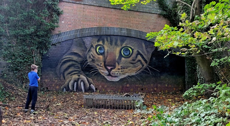 When I paint for myself around the town, I try to fit my works into the natural habitat and enhance the area. The cat I painted (included) used the natural curve of the bricks to create a hole through which the cat was trying to reach the young boy (my son). I have also painted skate ramps to look like a cage through which you can see the park behind. I find when you create something bespoke, and becoming of the area, the works then get left alone and not tagged by the local youth showing that the community accept and respect the works.