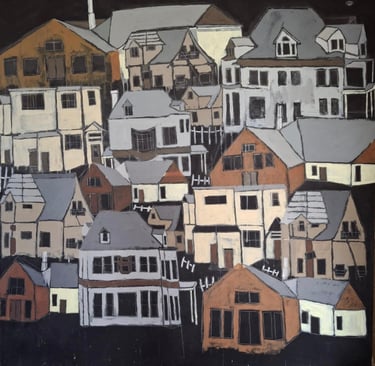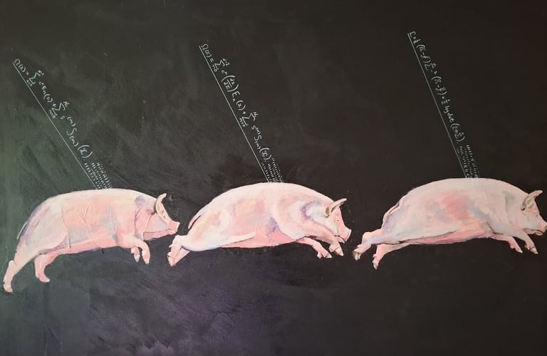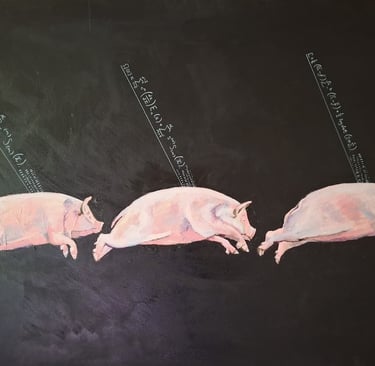 ANSWER 2. A lot of my work has been telling stories about things I've experienced or been through, from being diagnosed with schizoaffective disorder to visiting an anabaptist commune in my mid 20's (see painting - the bruderhof), and since the art is always such a part of my story I'm honestly not sure where I leave room for the viewer but I know it's there. I have a painting called "Gadarenes" that features three pigs running off a cliff and physics equations. This piece is actually about my domestic violence experience in 2015-2016, but people who don't know my story about the piece have actually come up to me and told me they find joy in it.