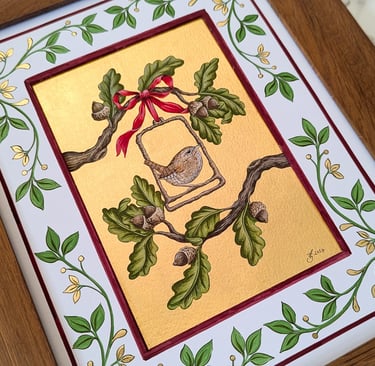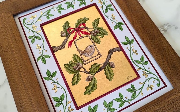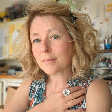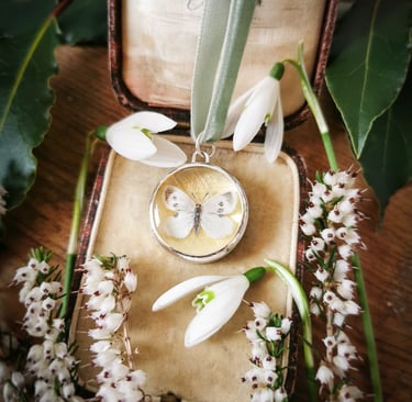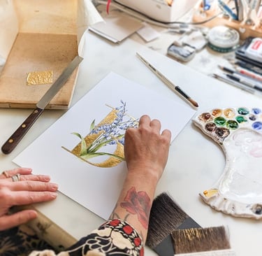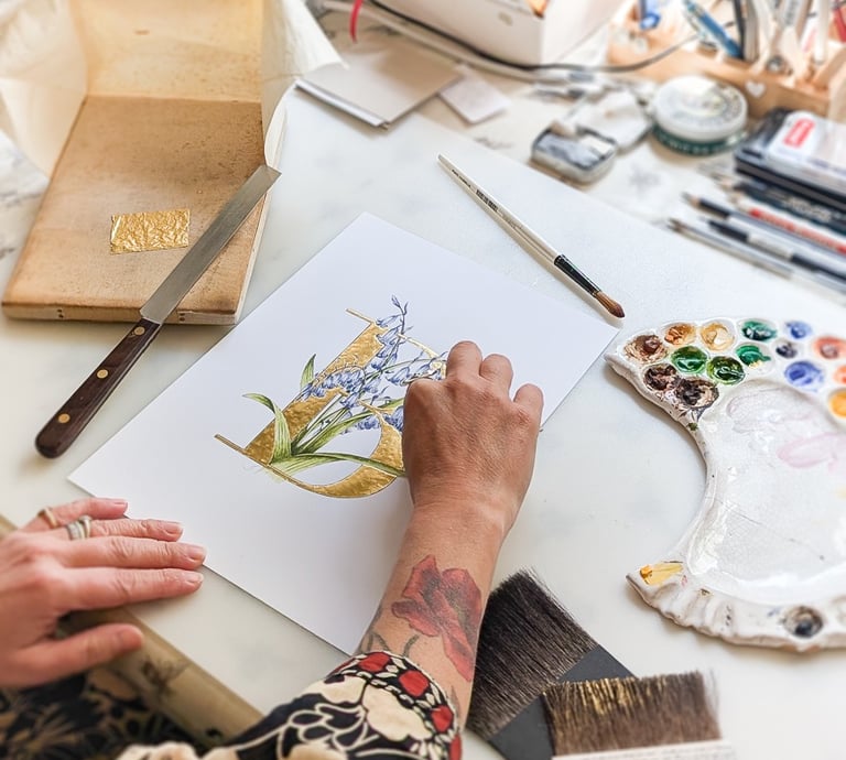 Today she works from home in her Somerset garden studio. Her love for nature, history and anything old rubs off on the work she creates today. Stubbornly refusing to ‘niche down’ to one medium or style, she takes great pleasure in following her creative curiosity to make pieces which spark joy. Botanical studies, whimsical jewellery, verre eglomise, plaster casts of nature finds, experimenting with materials and applying gold leaf to most things.