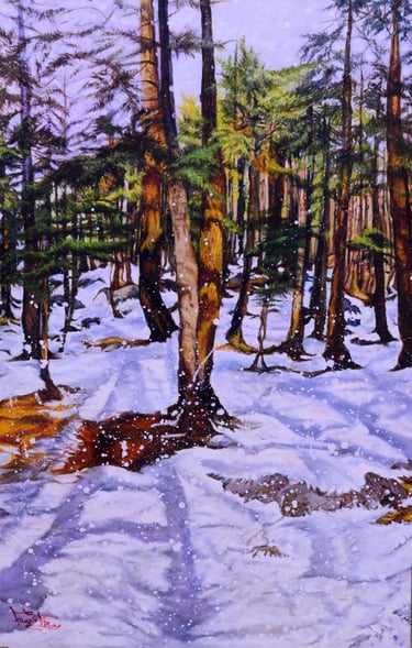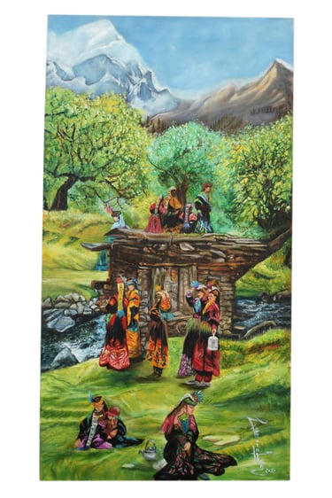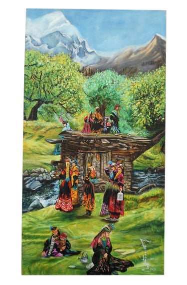 ANSWER 2. Kalash Valley painting is a part of my series on Kalash theme exhibited in my solo show in 2021. I wanted to show their life, dresses, culture, values and hardships through my work. Sometimes what we read is not enough without seeing it. The visual representation makes a lasting impact on a civilization we do not know much about due to their remoteness and lack of digital media exposure. Even now they seem to be immersed in their age-old customs and rituals while we have forgotten ours and only do things which are globally found acceptable.