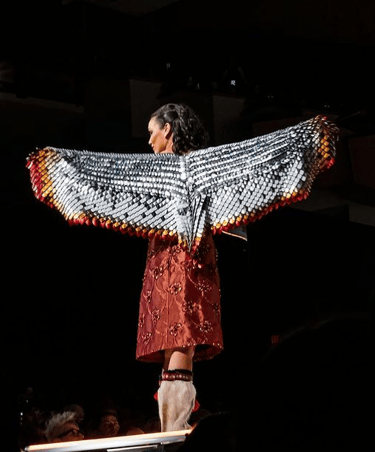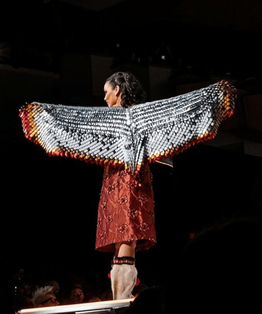 Angel of Fire and Snow - designed in collaboration with indigenous designer, Cheryl Fennell. Photograph by Ryan Walter Wagner. Anodized aluminium scales and rings. 2024.