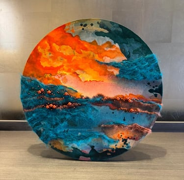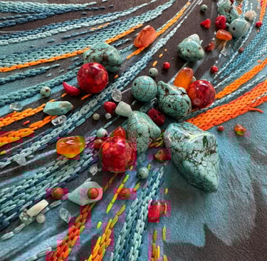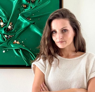 BIO: Bettina Kulakowski is a Dubai-based mixed media embroidery artist whose work fuses traditional craftsmanship with contemporary abstraction. She experiments with materials such as fabric, thread, wool, pearls, and natural gemstones—often repurposed from jewelry, clothing, and fabric scraps—to transform the discarded into something precious. Through layering and reworking, she creates intricate, tactile surfaces that invite close observation. Inspired by organic forms and natural structures, her art explores transformation, continuity, and the hidden beauty within fragments.