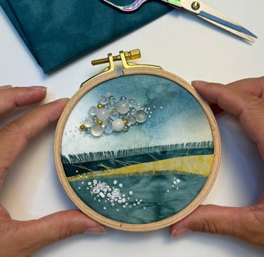 ANSWER 1. While embroidery has deep traditional roots, I approach it as an open field for experimentation rather than a fixed craft. I work intuitively, layering printed fabric, hand stitches, and repurposed materials like beads or jewelry fragments to create tactile compositions that feel alive and imperfect. By combining inherited techniques with unexpected materials and abstract forms, I move beyond decorative convention. My work becomes less about following tradition and more about reinterpreting it—transforming what is familiar into something personal, contemporary, and emotionally resonant.